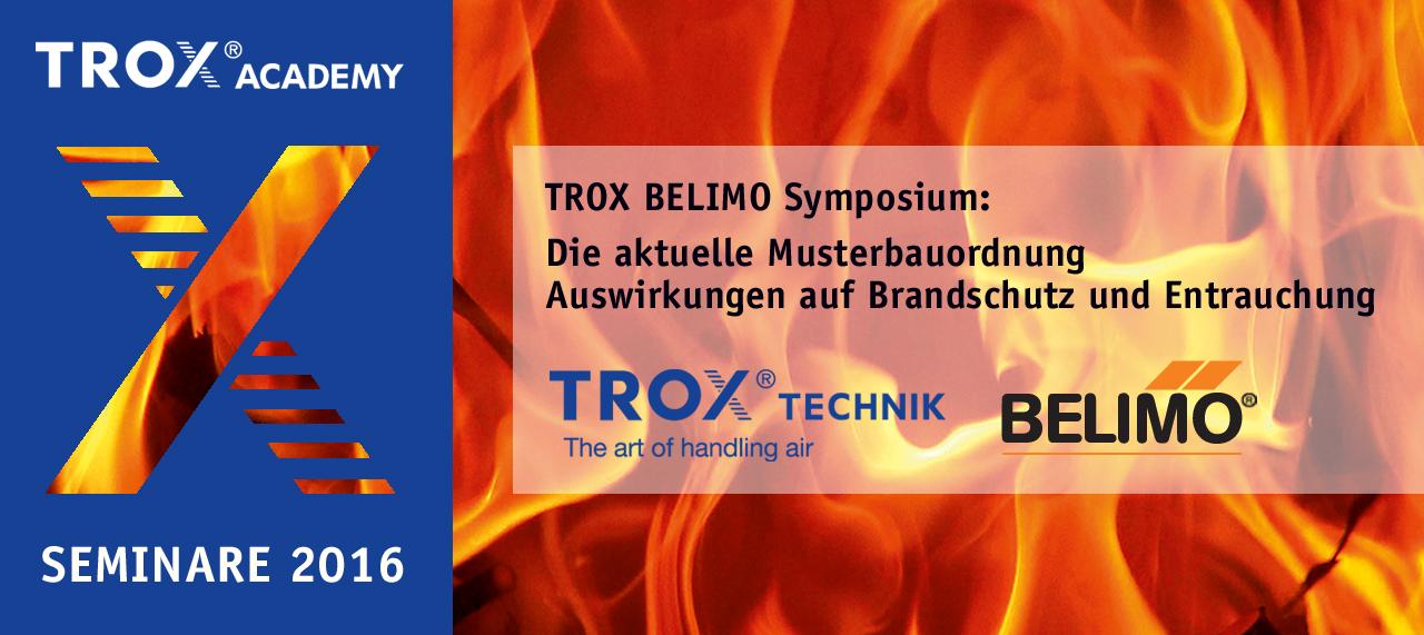 Ergänzend zu den Brandschutzseminar-„Klassikern“ der TROX Academy gibt es in 2016 wieder zwei ganz besondere bundesweite Seminarreihen. Die aktuelle Musterbauordnung (MBO) und deren Auswirkung auf Brandschutz und Entrauchung ist das Thema des ersten Seminars von TROX und Belimo, das am 23. und 24.2.2016 in Neukirchen-Vluyn startet. Die zweite TROXSeminarreihe ab Ende Mai befasst sich mit den neuen Herausforderungen an die Lüftungs- und Klimatechnik.